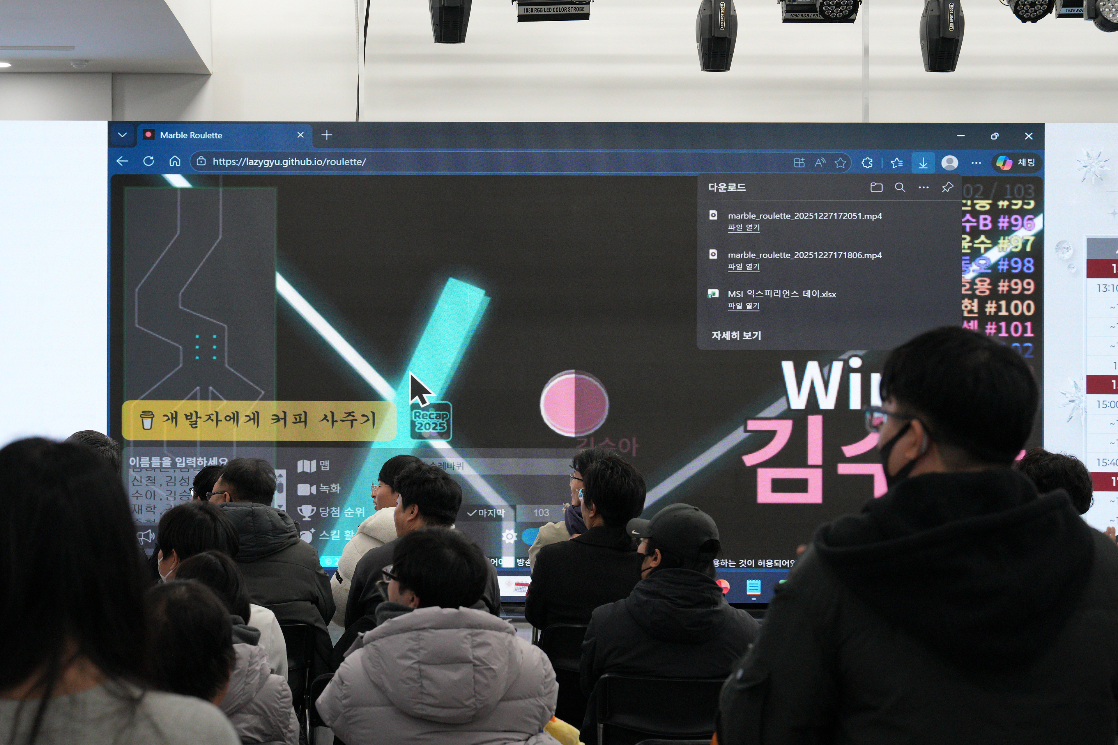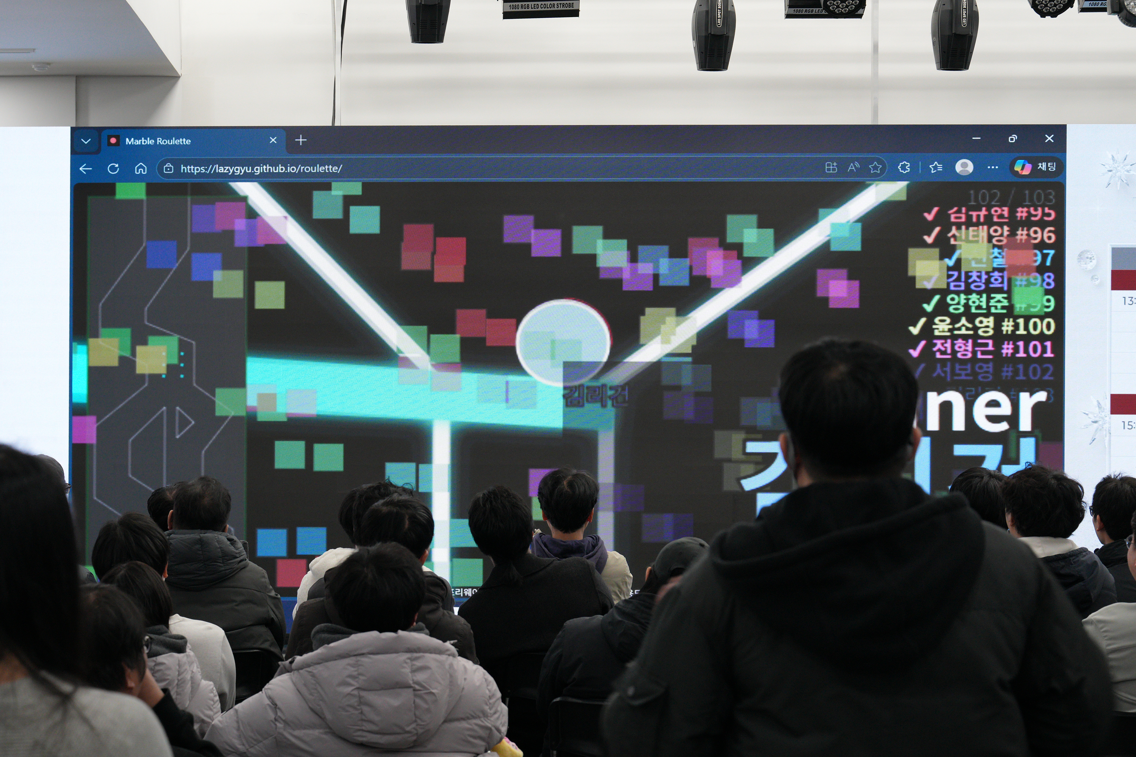 카훗 퀴즈 이벤트가 끝난 후에는 참석자 100명의 이름을 넣은 룰렛 추첨이 진행됐는데요. 공교롭게도 1등 당첨자가 럭키드로우 이전에 행사장을 떠난 상태여서, 재추첨을 진행했습니다.