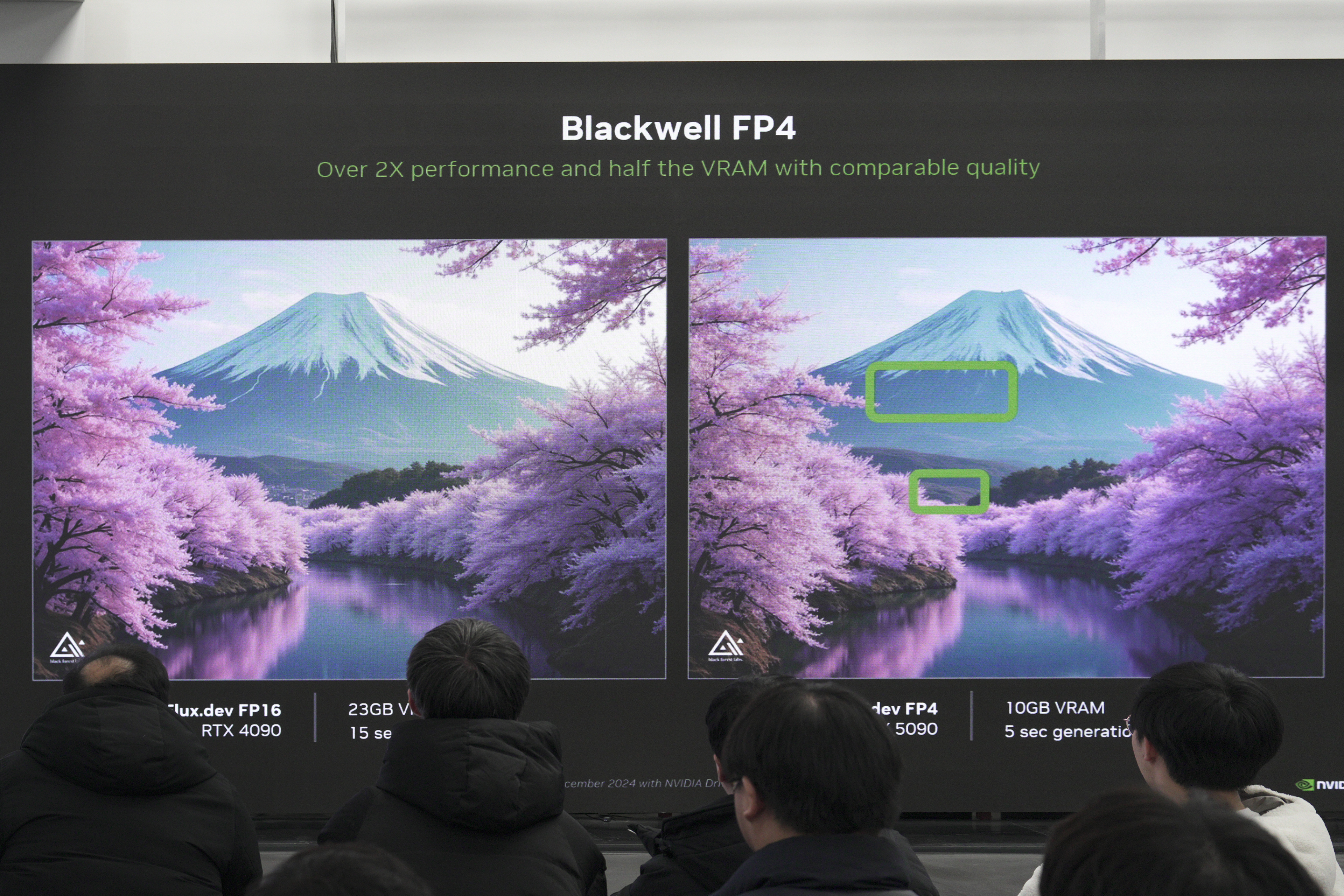 RTX 50 시리즈는 이전 RTX 40 시리즈가 FP8까지 지원했던 것과는 달리, FP4 부동소수점 연산을 지원해 AI 처리 성능을 끌어올렸다는 점을 강조했습니다.