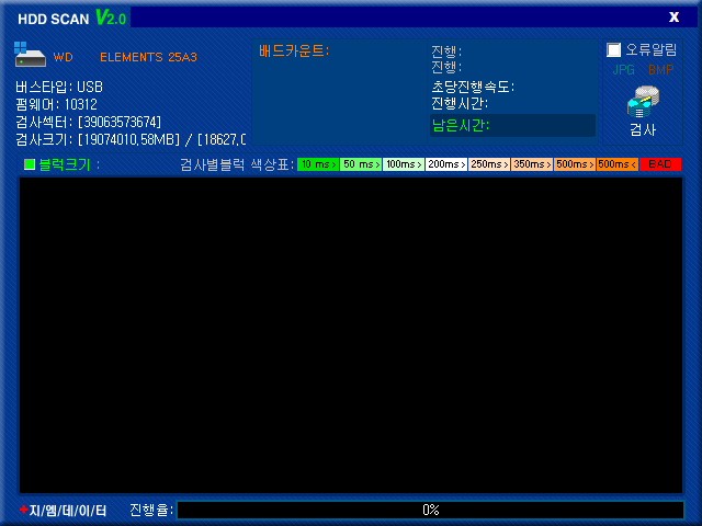 정상적으로 연결되면 우측 상단의 검사를 눌러 배드섹터 검사를 시작합니다.