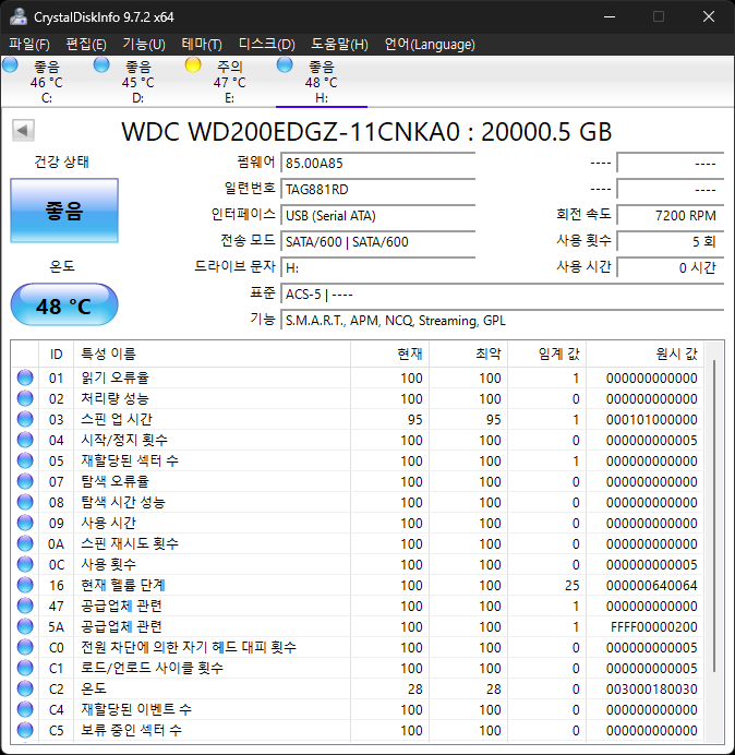 26시간에 걸친 검사를 마친 뒤, 크리스탈 디스크 인포를 통해 S.M.A.R.T 정보를 확인해 보았습니다. 결과는 특이사항 없이 정상 컨디션으로 표시되었습니다.