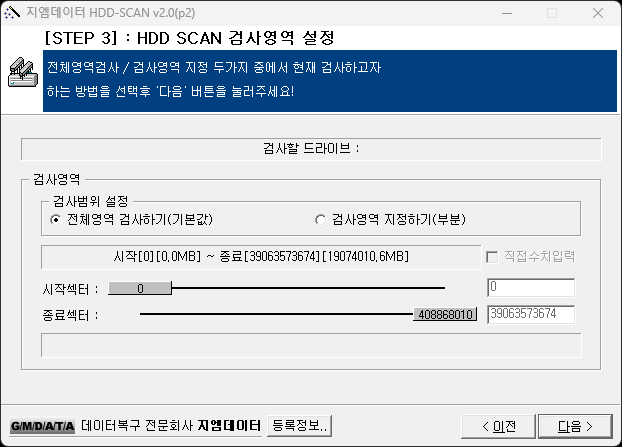 제품의 전체 컨디션을 보아야 하기 하므로 시작 섹터를 0, 종료 섹터를 우측 끝으로 조절한 뒤, 우측 하단의 다음을 클릭합니다.